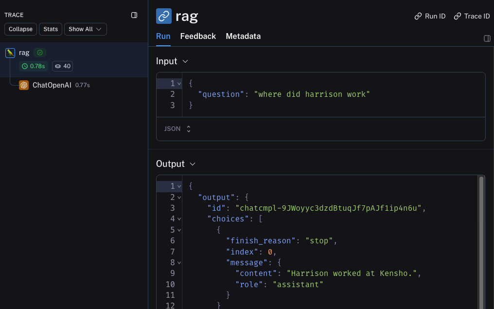 A huge part of having good observability during beta testing is collecting feedback. What feedback you collect is often application specific - but at the very least a simple thumbs up/down is a good start. After logging that feedback, you need to be able to easily associate it with the run that caused that. Luckily LangSmith makes it easy to do that. First, you need to log the feedback from your app. An easy way to do this is to keep track of a run ID for each run, and then use that to log feedback. Keeping track of the run ID would look something like:Metadata tab when inspecting the run. It should look something like this